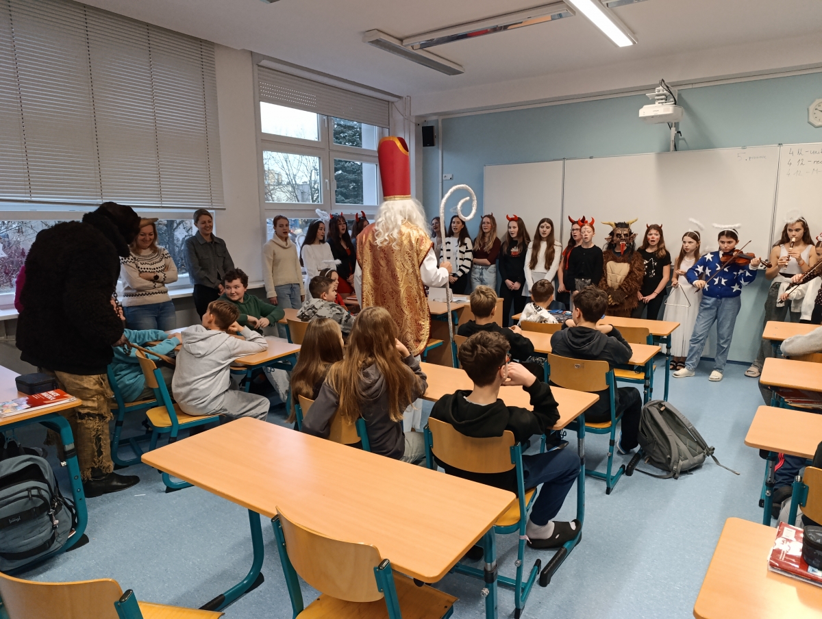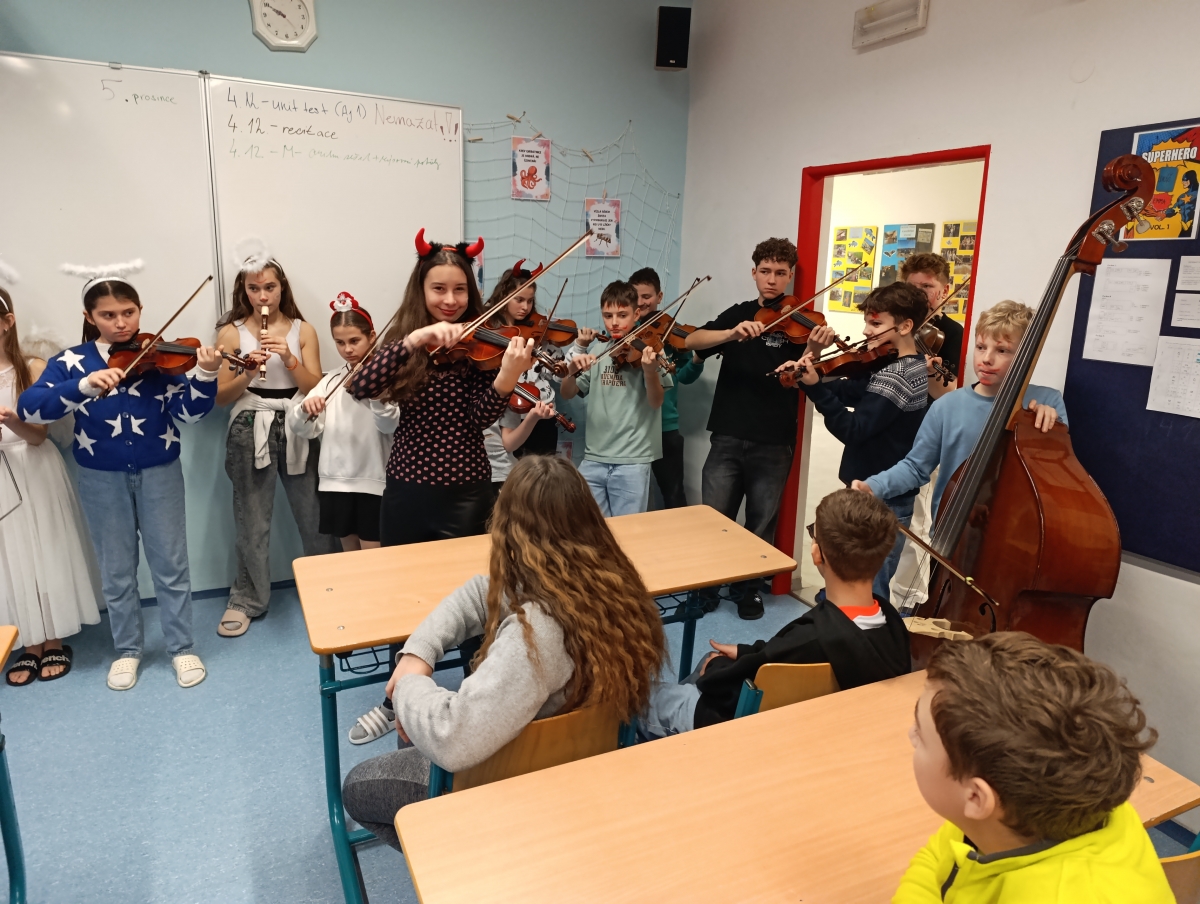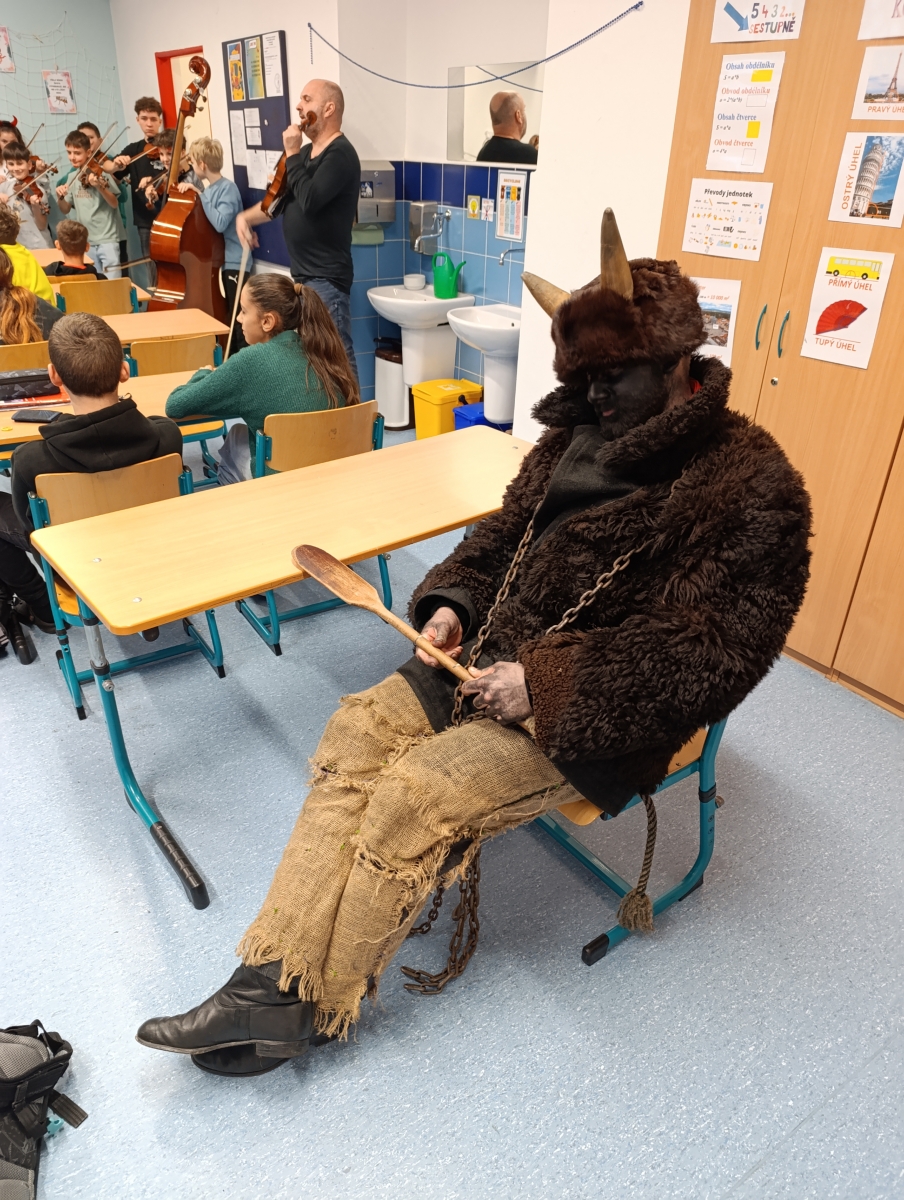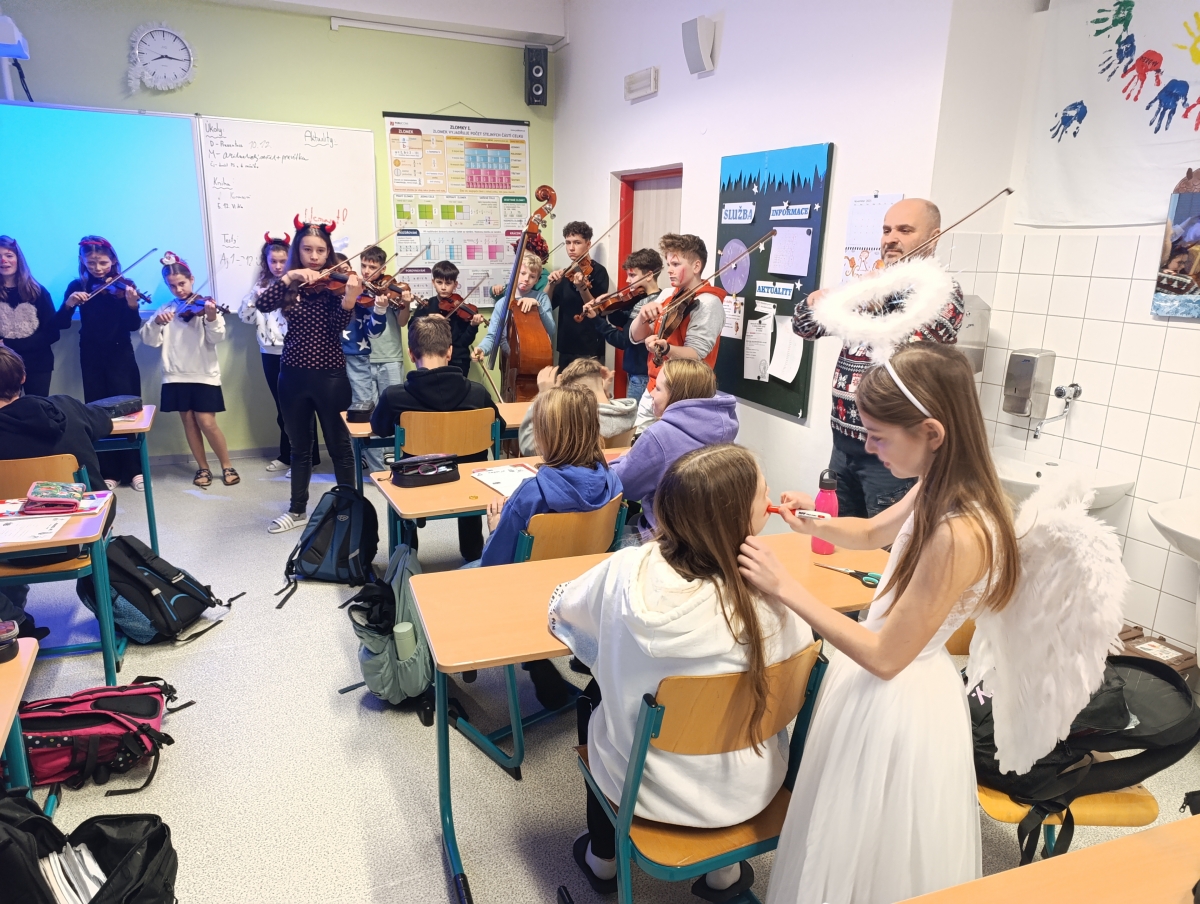 Následující den se již od ranních hodin nesly školou melodie vánočních koled. To školní cimbálová muzika s mikulášskou družinou obcházela jednotlivé třídy, aby jim nejenom zpříjemnila výuku, ale také aby odměnila všechny hodné a aby čert nezbedníky po zásluze potrestal.
