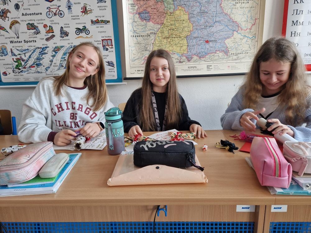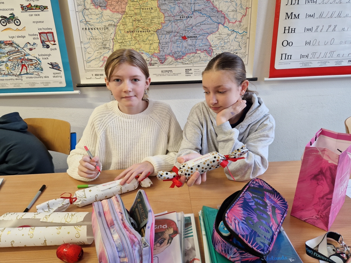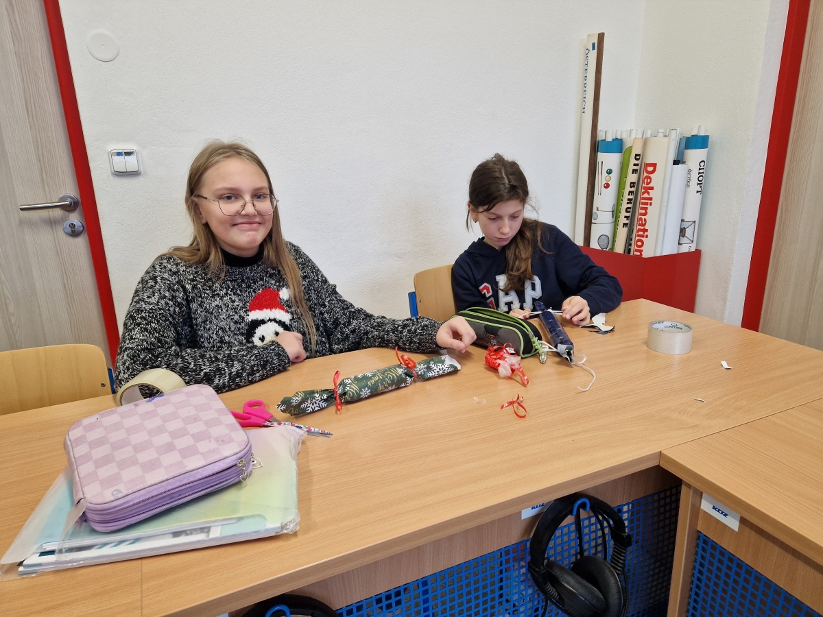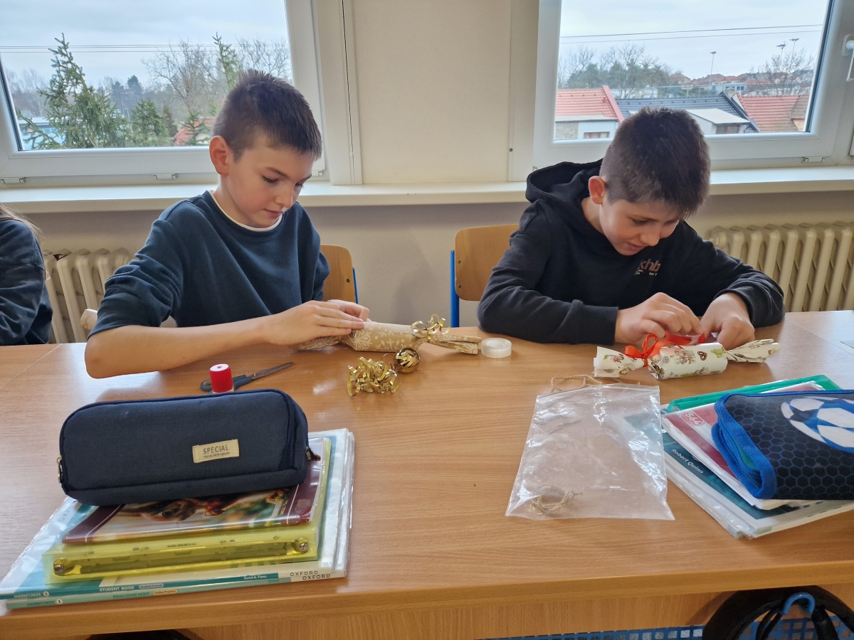 V průběhu prosince naši šesťáci ze třídy 6. B a 6. D nezaháleli a pilně začali pracovat na vánočním pozdravu pro francouzské kamarády. Jako první vyrobil každý vánoční přání s popisem, jak slavíme Vánoce u nás. A aby to nebylo jen tak, pustili jsme se s nadšením do vyrábění typických anglických vánočních výrobků, tzv. Christmas crackers. V originálním balení, které najdou lidé žijící na britských ostrovech, se nachází dárek, vtip a papírová korunka. Naše děti je naplnily malými dárečky, sladkostmi a pečlivě zabalily.