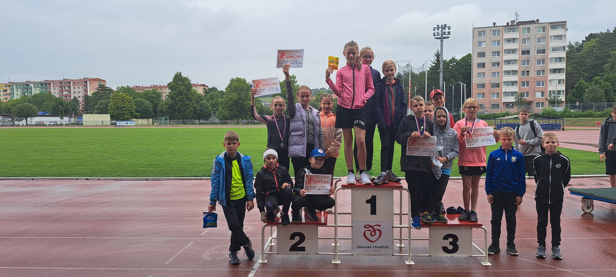 Ve středu 22. 5. za deštivého počasí se naši žáci zúčastnili "Atletické olympiády" na Městském atletickém stadionu v Uh. Hradišti. I když počasí bylo nepříznivé, tak se podařilo našim žáčkům zabojovat a v některých disciplínách i zvítězit. Závodilo se v disciplínách: skok do dálky s rozběhem, hod míčkem do dálky, běh 50 m a běh 600 m. Celé to uzavřela štafeta dívky / chlapci mladší a dívky / chlapci starší. Z 18 škol celého okresu jsme ve štafetě 4 x 60 m, přivezli do školy 1. místo - dívky starší ve složení: Vlková Laura, Němčická Miriam, Kachtíková Kristýna a Dobešová Eliška, 2. místo - mladší chlapci ve složení: Sadílek Patrik, Sadílek Albert, Kavalec Patrik a Viktor Burdziński. Další úspěšné výsledky jednotlivých disciplín: 2. místo Tereza Psotková – skok do dálky s rozběhem / dívky mladší, 3. místo Adriana Ševčíková – běh 600 m / dívky mladší, 1. místo Patrik Kavalec – skok do dálky s rozběhem / chlapci mladší, 4. místo Miriam Němčická – běh 50 m / dívky starší, 4. místo Kristýna Kachtíková – hod míčkem do dálky / dívky starší.
