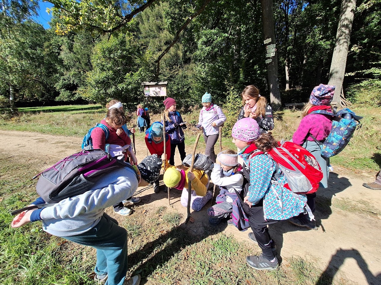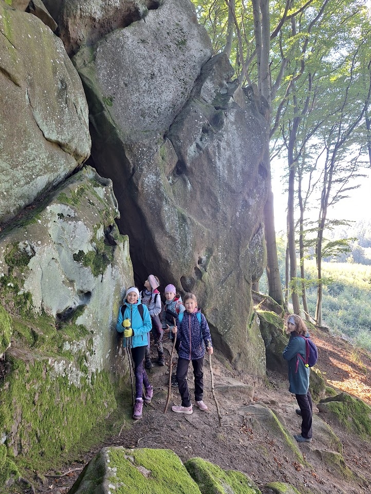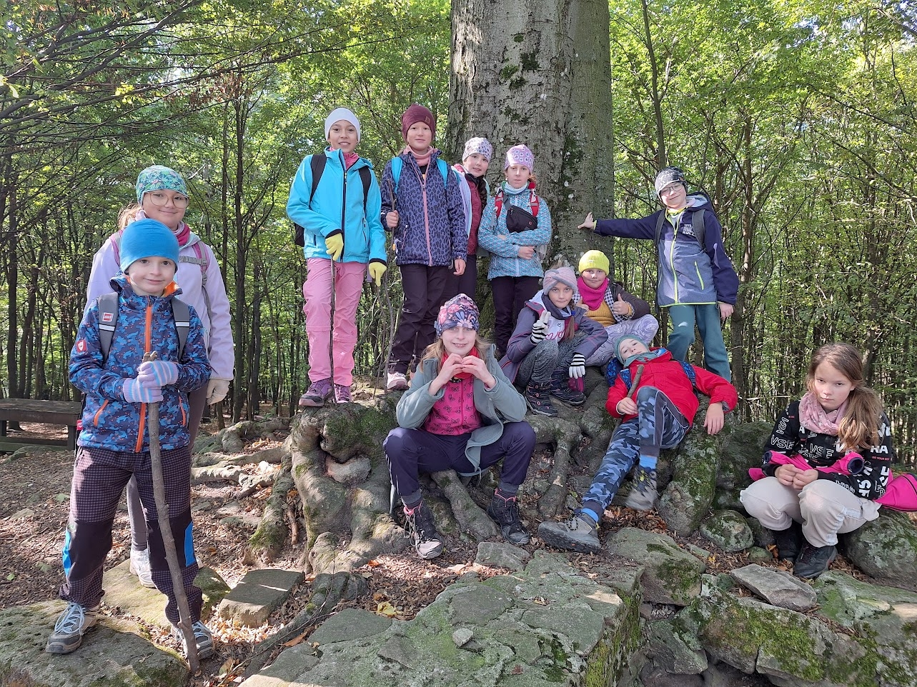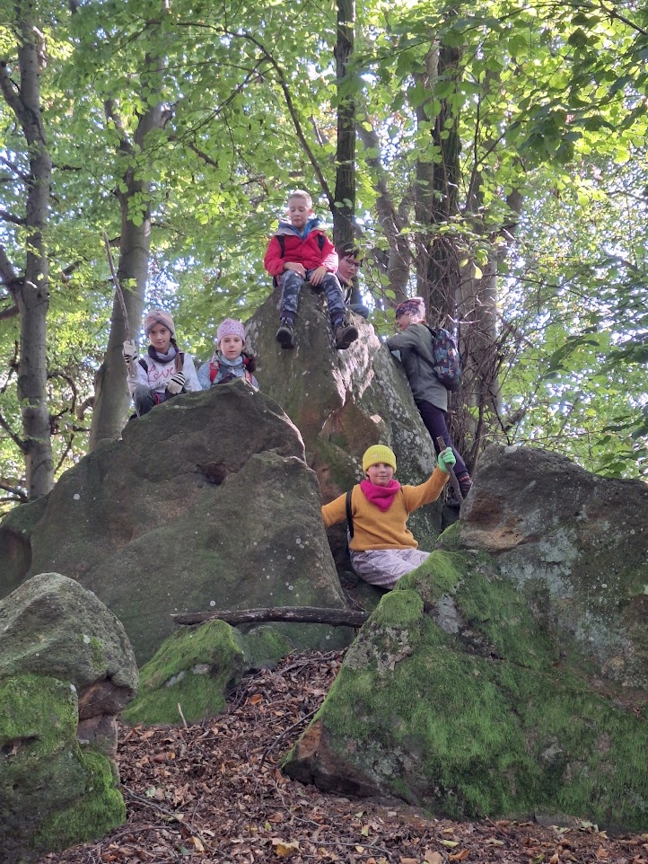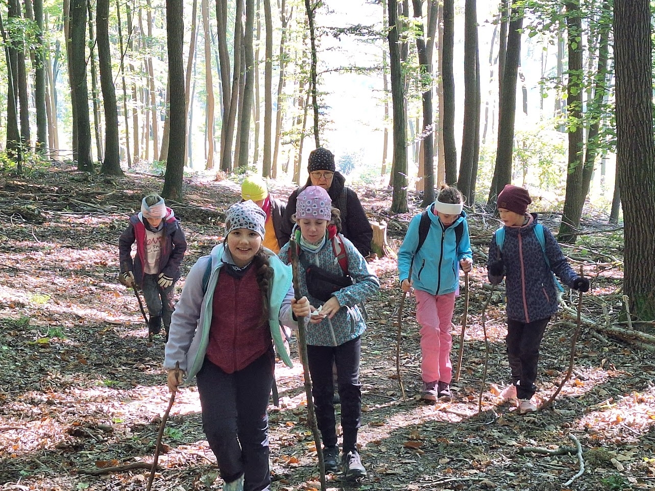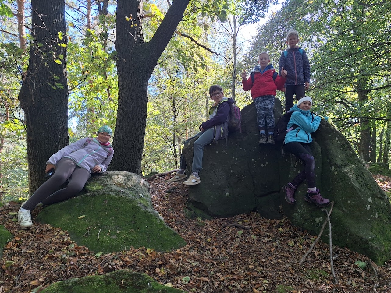 Počasí bylo na říjen nezvykle chladné až mrazivé, zato slunečné, s jasně modrou oblohou. Naše trasa vedla lesem, přes louky i skalnatý terén. Ze skal jsme obdivovali nádherné výhledy do krajiny – a samozřejmě jsme si také udělali hodně pěkných fotografií na památku. Na prosluněných Moravských loukách uprostřed lesů jsme obdivovali květy ocúnů, podařilo se nám zahlédnout kudlanku nábožnou a cestou jsme si nasbírali i několik lesklých čerstvých kaštanů na tvoření.