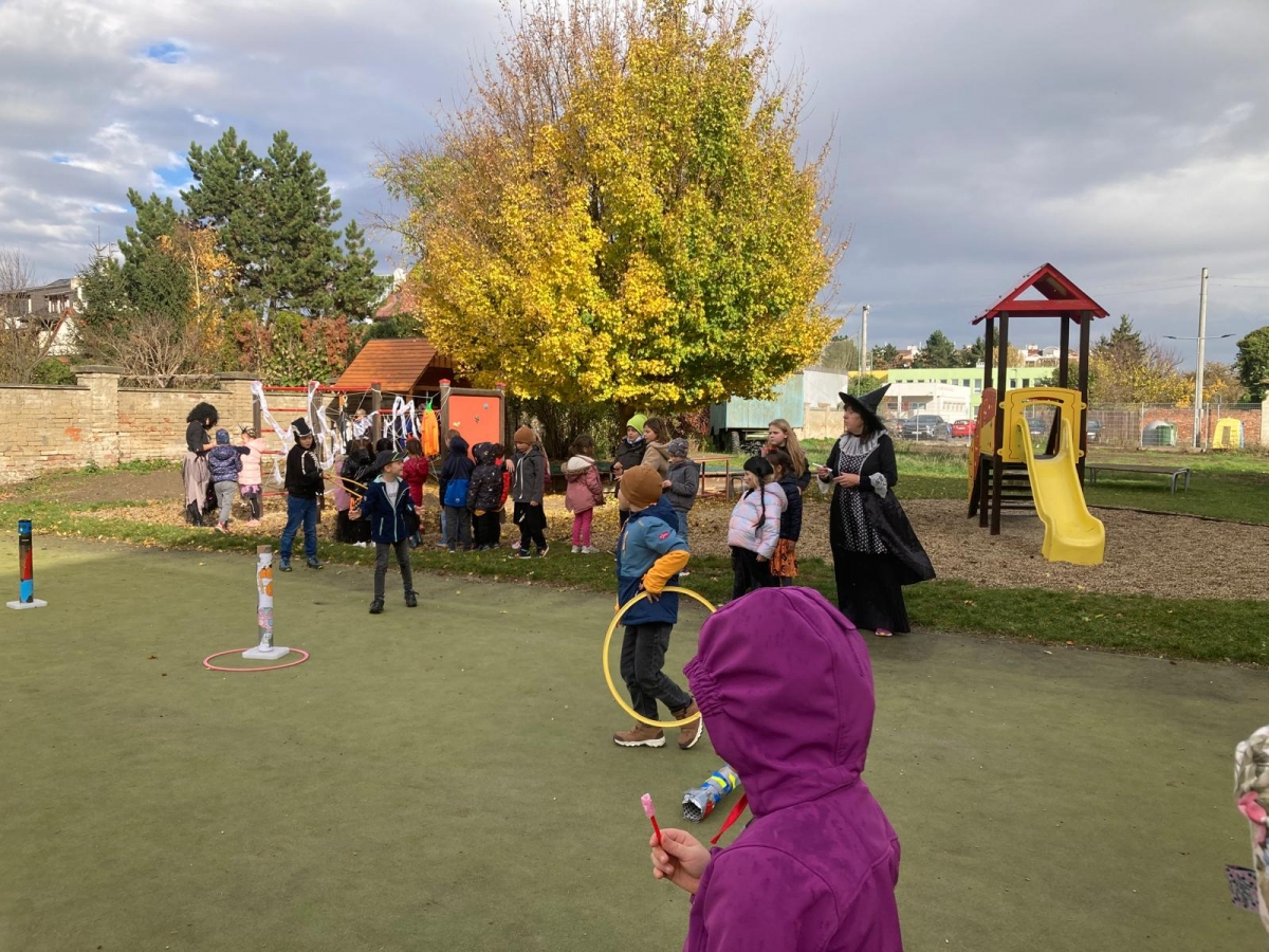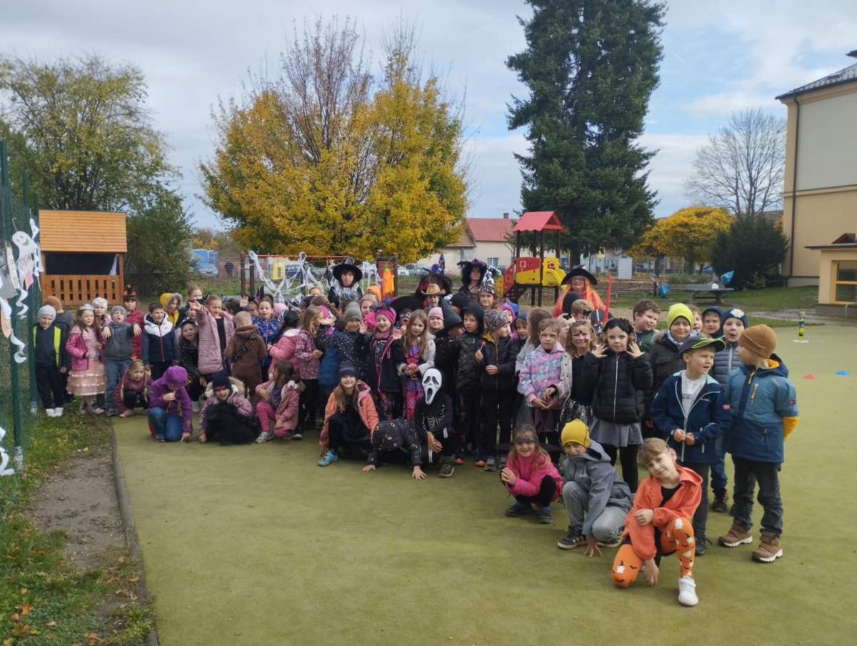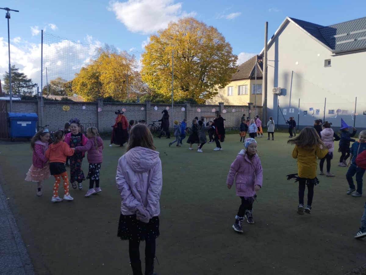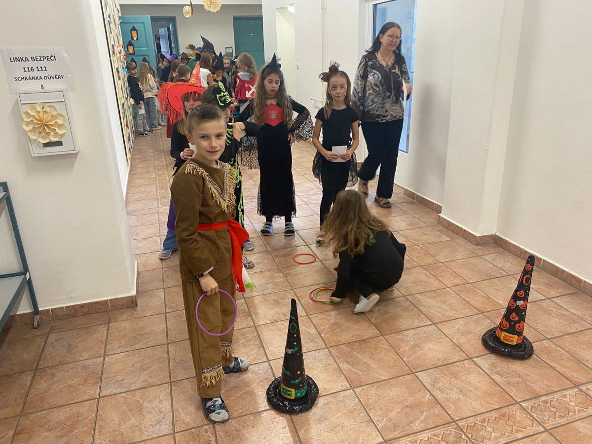 Dnešní školní družina se proměnila v kouzelný halloweenský svět plný úkolů, smíchu a malých strašidýlek. Na děti čekalo mnoho strašidelných i legračních disciplín- slalom na koštěti, vození dýně v kolečku, házení kroužku nebo nošení dračího oka na lžíci. Nechyběly ani úkoly pro odvážné: děti musely najít cestu z pavučiny ven a ve strašidelném domku sáhnout do čarodějné bedny, kde na ně čekala odměna. Poté si každý mohl ozdobit vlastní halloweenský perníček a pochlubit se svým výtvorem. Na vedlejší budově děti také plnily tematické aktivity- foukaly brčkem malé pavoučky po lavici, zkoušely trefit halloweenský klobouk obručí, chytaly ,,rybičky" a nakonec se pomocí papírových ,,kroků" dostávaly až k podzimním listům, kde na ně čekala odměna. Následovala halloweenská párty, při které se všichni pořádně vyřádili.