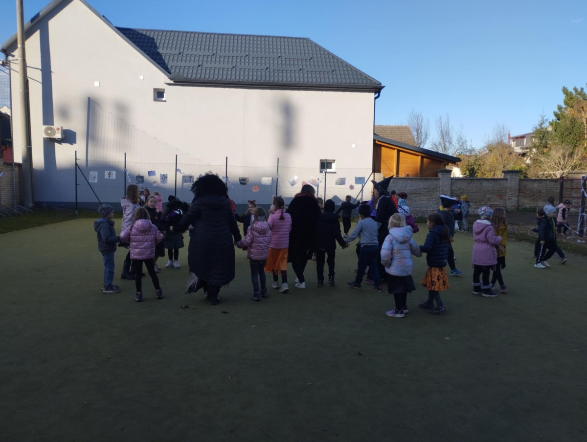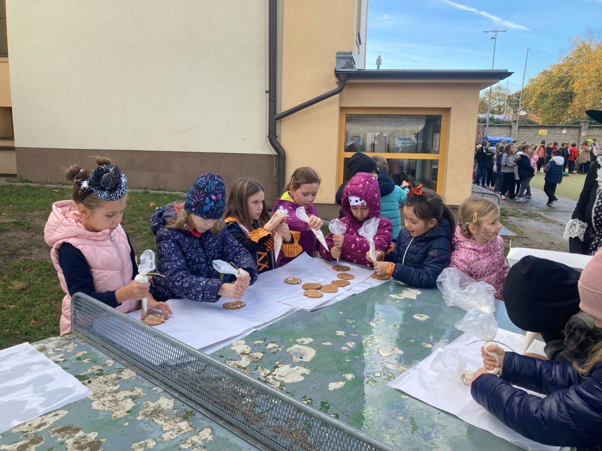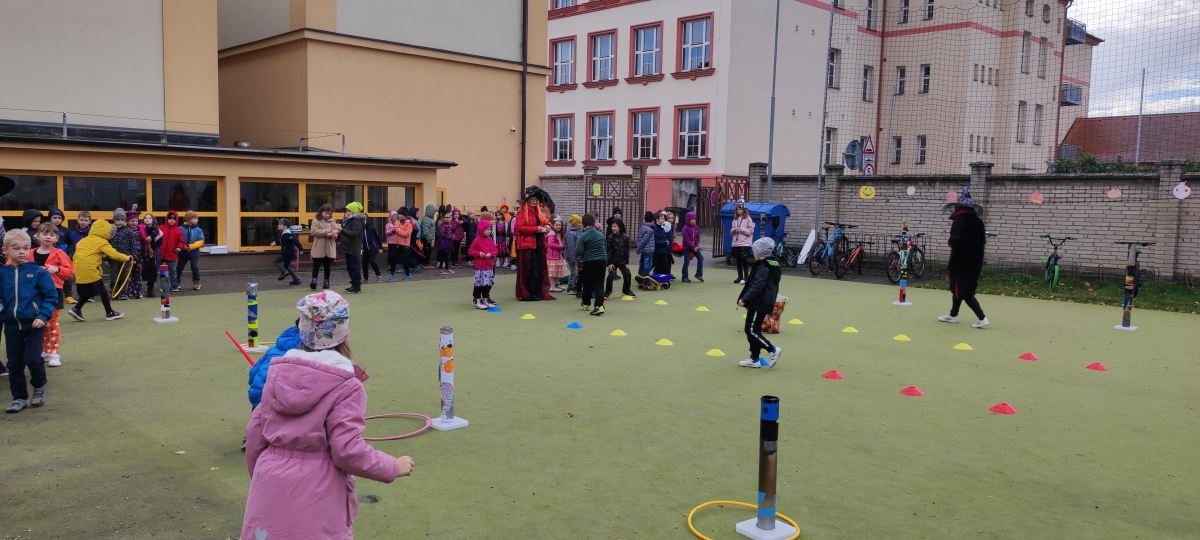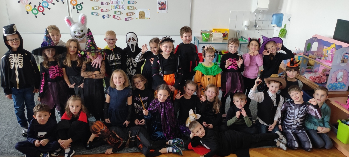 Dnešní školní družina se proměnila v kouzelný halloweenský svět plný úkolů, smíchu a malých strašidýlek. Na děti čekalo mnoho strašidelných i legračních disciplín- slalom na koštěti, vození dýně v kolečku, házení kroužku nebo nošení dračího oka na lžíci. Nechyběly ani úkoly pro odvážné: děti musely najít cestu z pavučiny ven a ve strašidelném domku sáhnout do čarodějné bedny, kde na ně čekala odměna. Poté si každý mohl ozdobit vlastní halloweenský perníček a pochlubit se svým výtvorem. Na vedlejší budově děti také plnily tematické aktivity- foukaly brčkem malé pavoučky po lavici, zkoušely trefit halloweenský klobouk obručí, chytaly ,,rybičky" a nakonec se pomocí papírových ,,kroků" dostávaly až k podzimním listům, kde na ně čekala odměna. Následovala halloweenská párty, při které se všichni pořádně vyřádili.