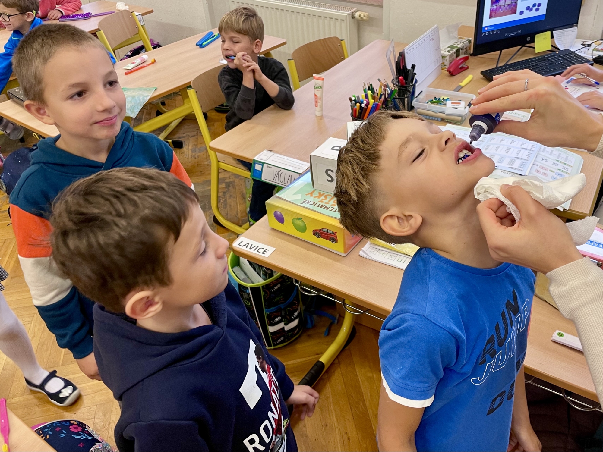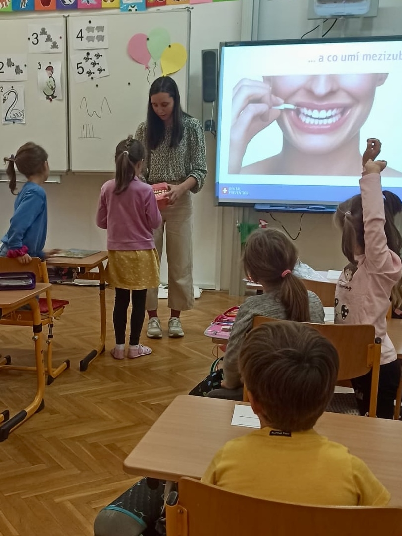 Odpovědi na tyto otázky a spoustu dalších užitečných informací se v pátek 17. 10. dozvěděly děti v prvních třídách v rámci preventivního programu Zdravé zuby od studentek zubního lékařství. Společně si pak všichni ukázali, jak zuby správně čistit, a stateční dobrovolníci si vyzkoušeli i identifikátor zubního plaku.
