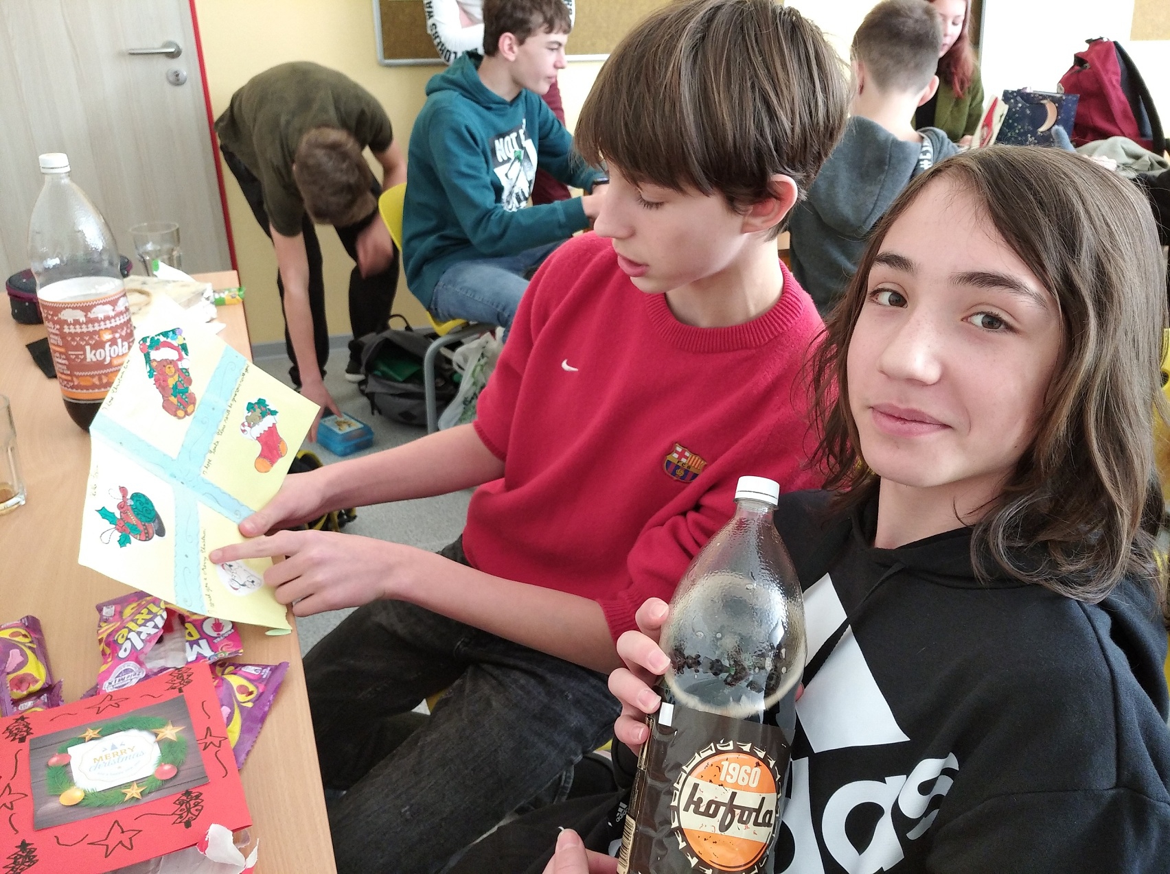 Poslední den před vánočními prázdninami dorazilo pro celou třídu 8.D nečekané překvapení. Balík z Francie plný vánočních přání a malých dárečků. S paní učitelkou Chvojkovou jsme žáky navštívili ve chvíli, kdy si dopékali buchtu a radovali se z dárků, které si mezi sebou nadělili. A jaké to měli najednou nečekané překvapení! Francouzští kamarádi jim vyrobili originální přání a popřáli krásné Vánoce.
