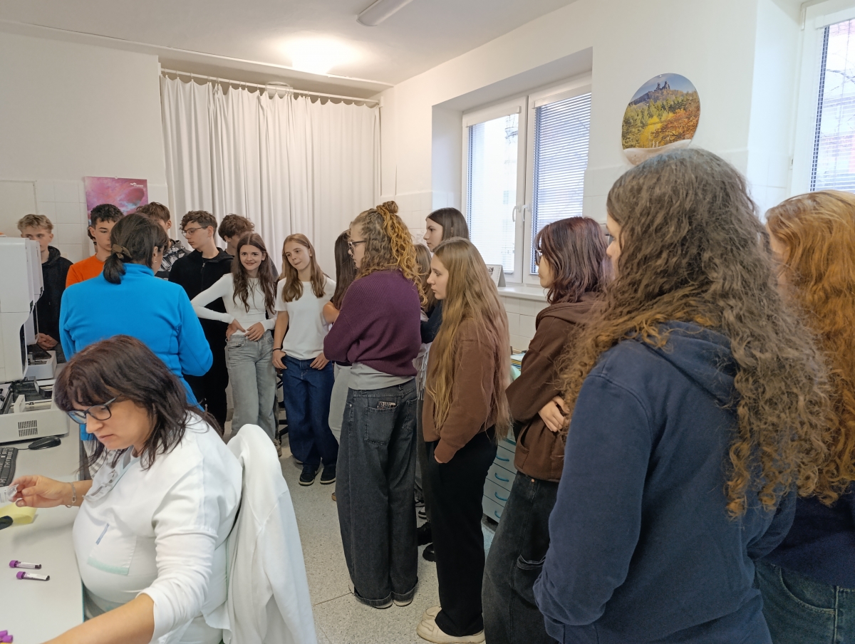 Následně jsme se rozdělili na dvě skupinky a vyrazili přímo na oddělení. Jako první jsme navštívili hematologii, kde nám ukázali, jak se pozná, jakou krevní skupinu pacienti mají. Pak jsme se přesunuli k potrubní poště a viděli, jak rychle se díky ní dopravují vzorky po celé nemocnici. Po krátké svačině jsme se vydali na poslední zastávku – dětské oddělení, které bylo ale plné, takže jsme mohli nahlédnout jen do dvou místností. I přesto jsme si celou exkurzi moc užili a odnesli jsme si spoustu nových poznatků.