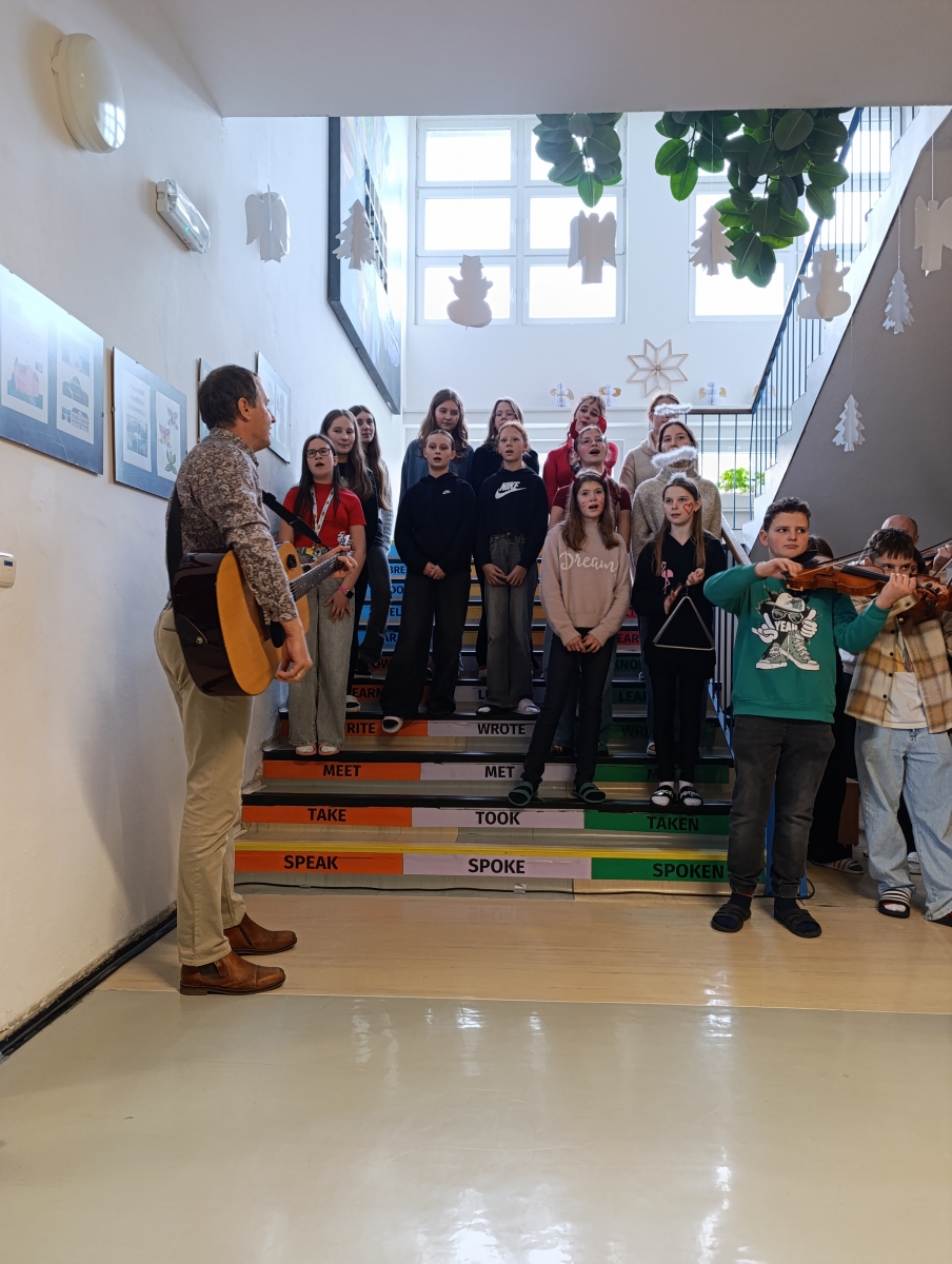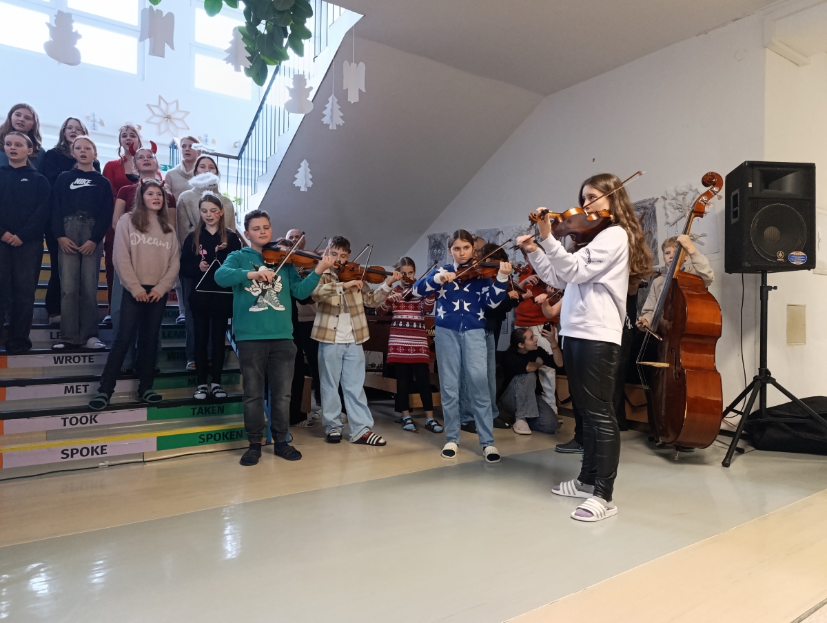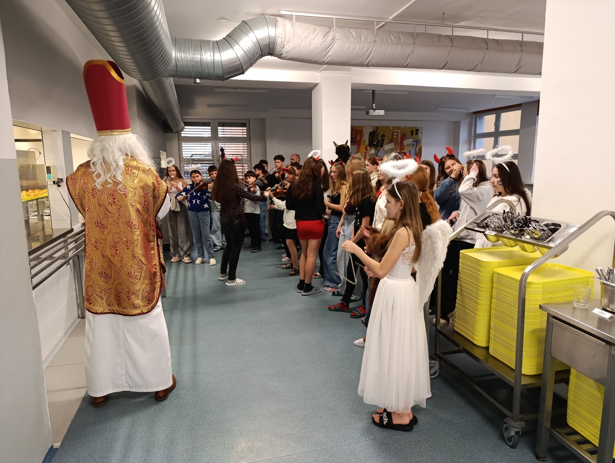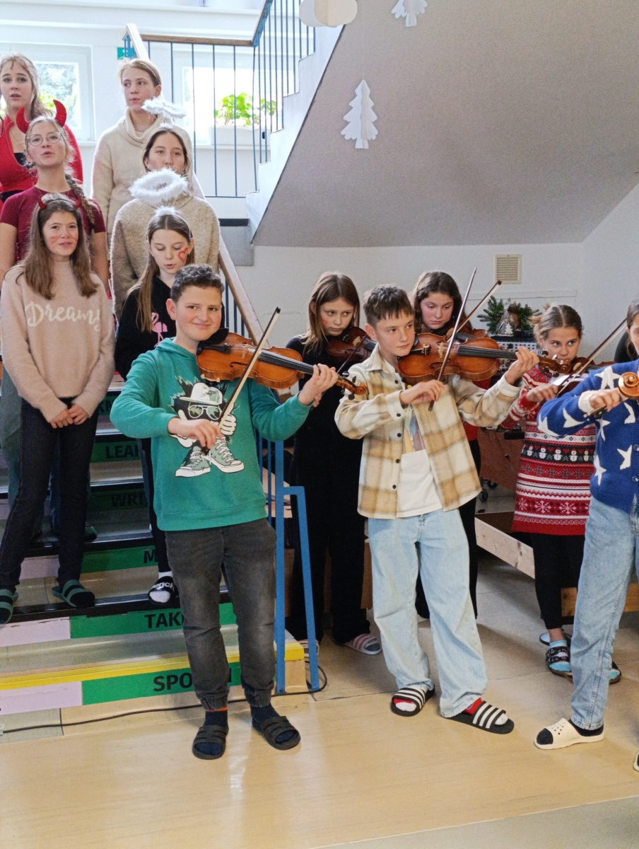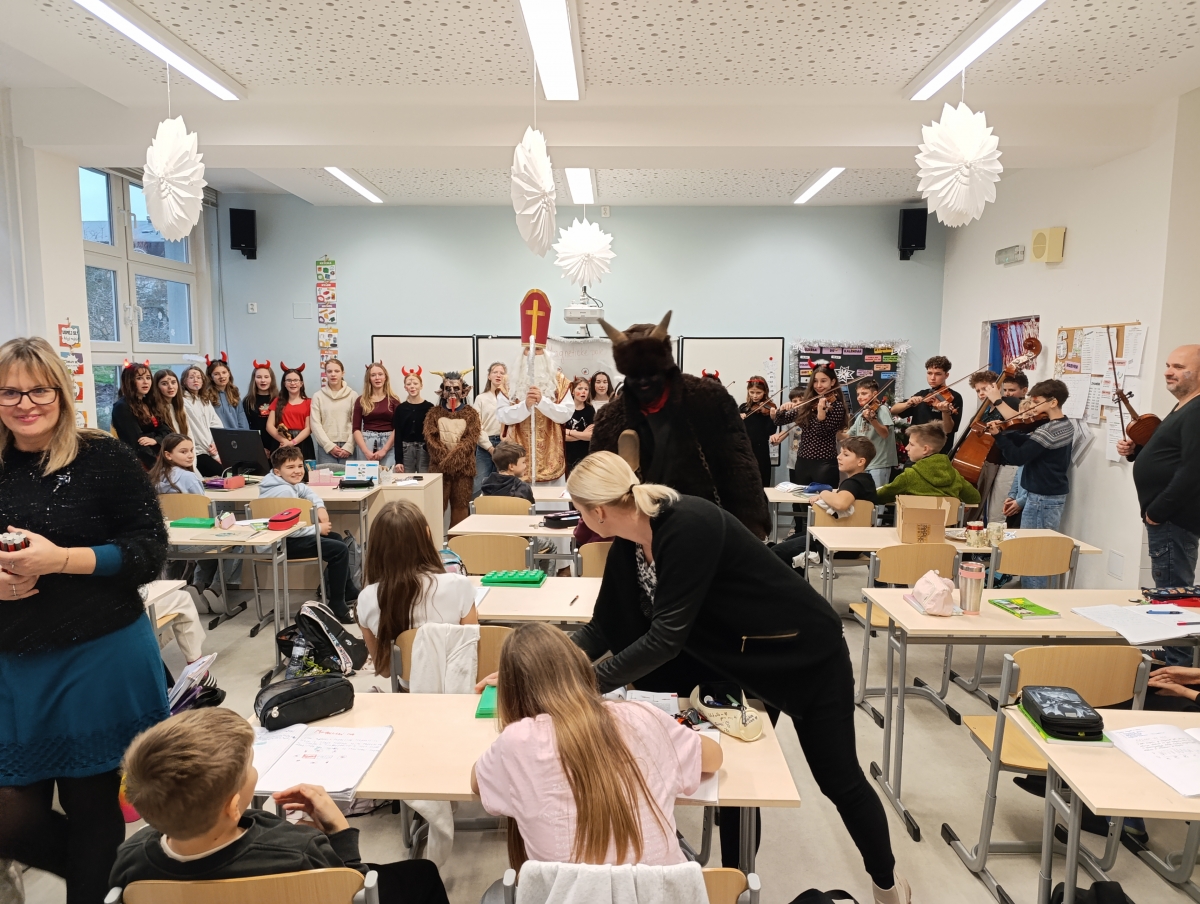 Následující den se již od ranních hodin nesly školou melodie vánočních koled. To školní cimbálová muzika s mikulášskou družinou obcházela jednotlivé třídy, aby jim nejenom zpříjemnila výuku, ale také aby odměnila všechny hodné a aby čert nezbedníky po zásluze potrestal.