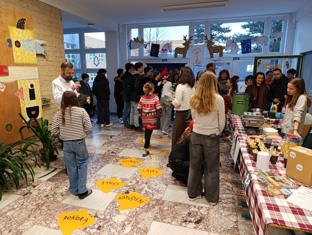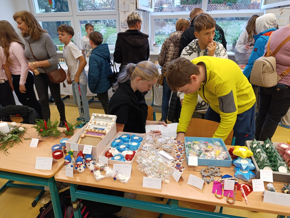 Pak už začal jarmark, na kterém třídy prodávaly své výrobky. Nabídka byla pestrá a každý si mohl najít to své. Převládaly vánoční ozdoby, věnce, sladkosti a samozřejmě vánoční cukroví. Jarmark nás jako vždy mile překvapil, neboť ukázal, jak zručné a šikovné (nejenom) žáky naše škola má.
