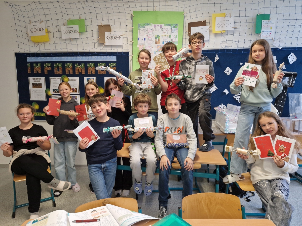 V průběhu prosince naši šesťáci ze třídy 6. B a 6. D nezaháleli a pilně začali pracovat na vánočním pozdravu pro francouzské kamarády. Jako první vyrobil každý vánoční přání s popisem, jak slavíme Vánoce u nás. A aby to nebylo jen tak, pustili jsme se s nadšením do vyrábění typických anglických vánočních výrobků, tzv. Christmas crackers. V originálním balení, které najdou lidé žijící na britských ostrovech, se nachází dárek, vtip a papírová korunka. Naše děti je naplnily malými dárečky, sladkostmi a pečlivě zabalily.