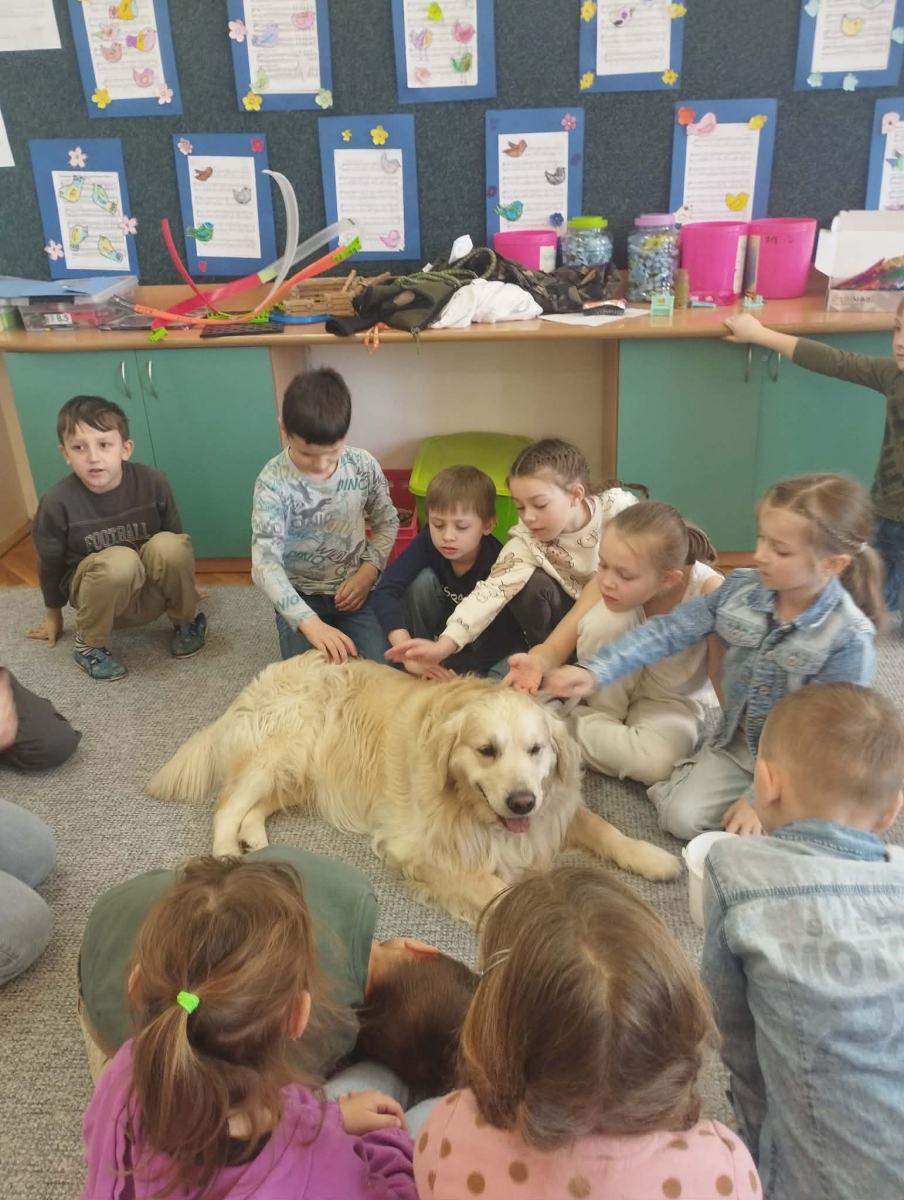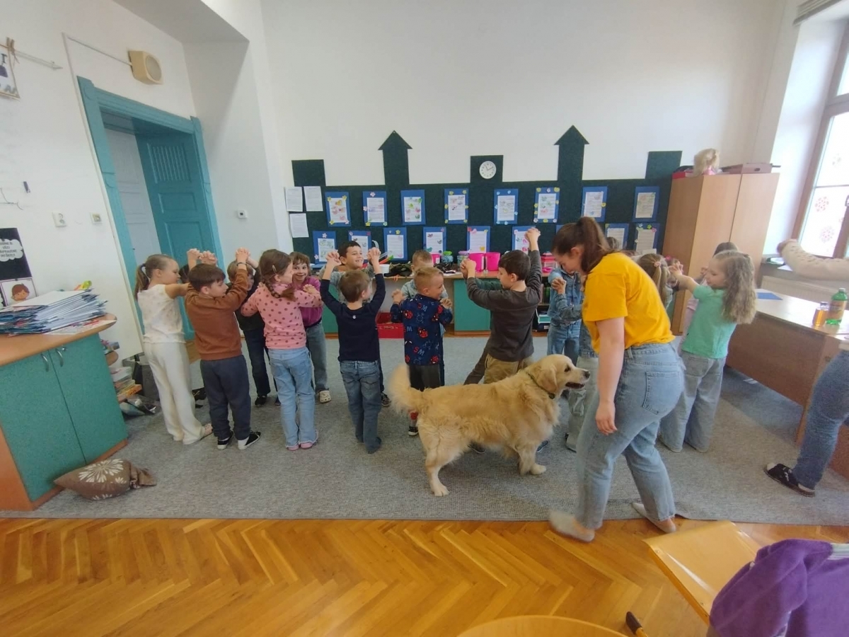 Po přivítání s lektorkou si její svěřenec Archibald, tedy Archie, všechny děti pečlivě očichal, ony si ho na oplátku pohladily a lekce mohla začít. Nejprve jsme si pejska zkusili učesat speciálním hřebenem, což se mu překvapivě líbilo, a pak nás čekala spoustu úkolů. V těch jsme postupně využili znalosti z českého jazyka, matematiky a doplnili jsme je informacemi právě ze života psů. Zkusili jsme si určit psí rasu podle nápovědy a obrázku, pojmenovat pomůcky na výcvik psů i potřeby, které každý majitel psa musí vlastnit. Proběhla i pohybová štafeta, které byl Archie součástí, a nakonec si děti psa mohly dokonce podlézt. Za všechno, co s dětmi Archie vydržel, byl v průběhu celé lekce poctivě odměňován drobnými psími pamlsky. Na úplný závěr se pak děti ještě s tímto úžasným trpělivým "terapeutem" pomazlily a byl čas se rozloučit.