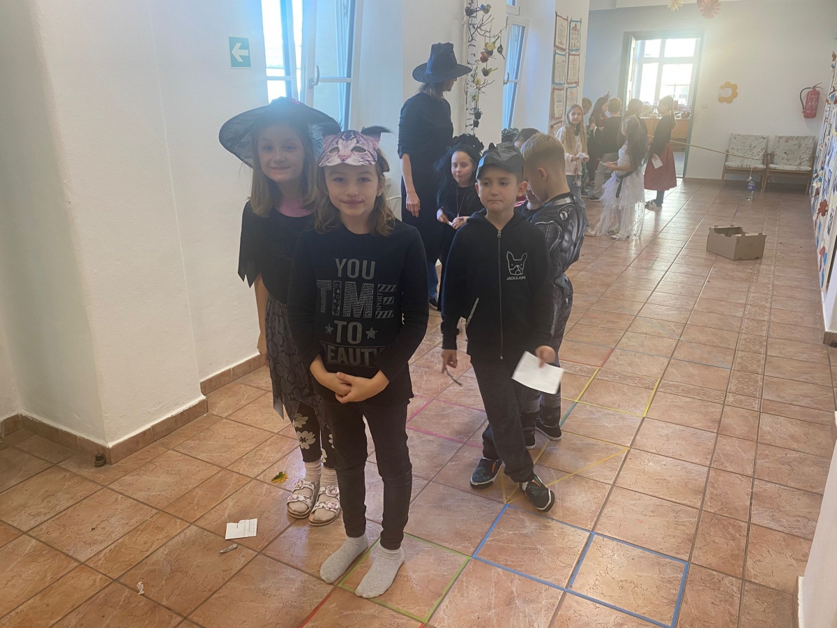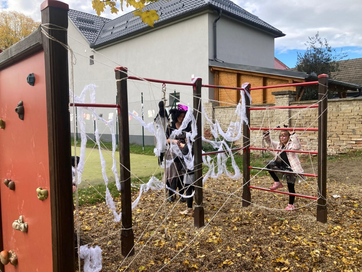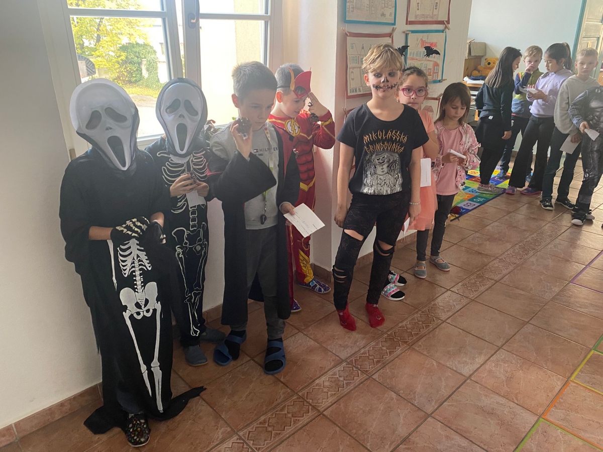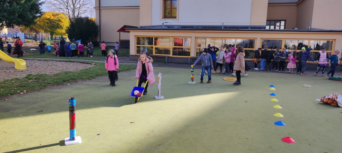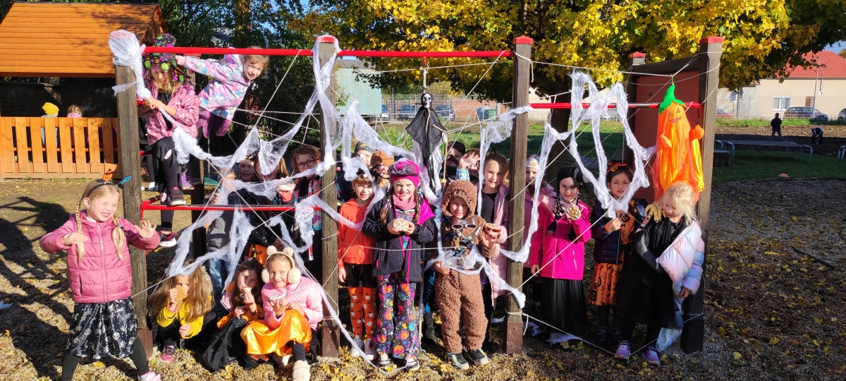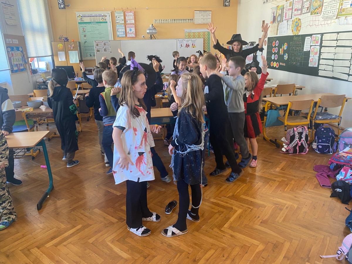 Dnešní školní družina se proměnila v kouzelný halloweenský svět plný úkolů, smíchu a malých strašidýlek. Na děti čekalo mnoho strašidelných i legračních disciplín- slalom na koštěti, vození dýně v kolečku, házení kroužku nebo nošení dračího oka na lžíci. Nechyběly ani úkoly pro odvážné: děti musely najít cestu z pavučiny ven a ve strašidelném domku sáhnout do čarodějné bedny, kde na ně čekala odměna. Poté si každý mohl ozdobit vlastní halloweenský perníček a pochlubit se svým výtvorem. Na vedlejší budově děti také plnily tematické aktivity- foukaly brčkem malé pavoučky po lavici, zkoušely trefit halloweenský klobouk obručí, chytaly ,,rybičky" a nakonec se pomocí papírových ,,kroků" dostávaly až k podzimním listům, kde na ně čekala odměna. Následovala halloweenská párty, při které se všichni pořádně vyřádili.