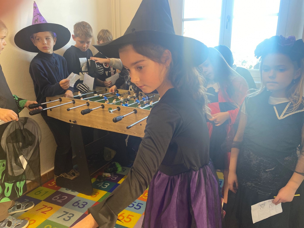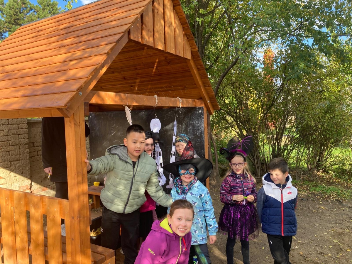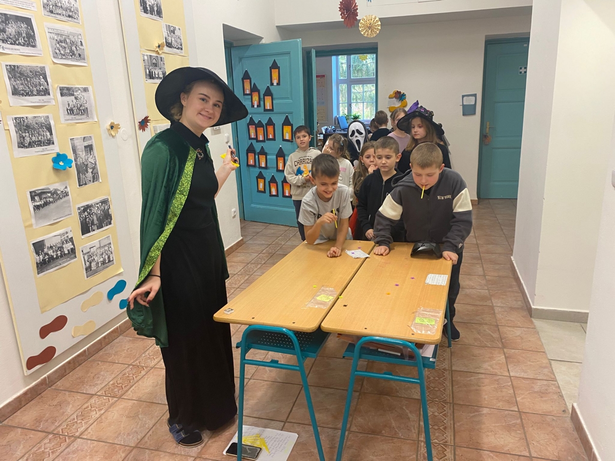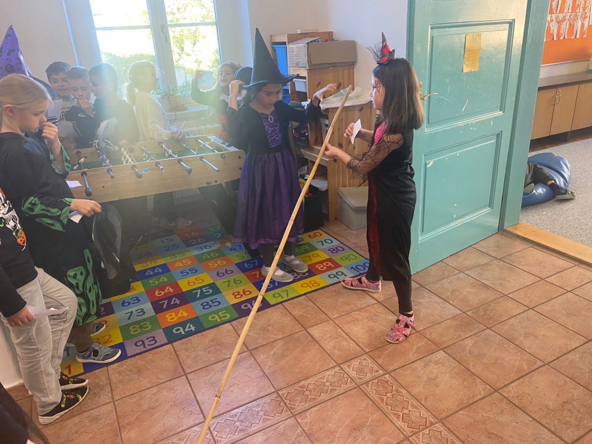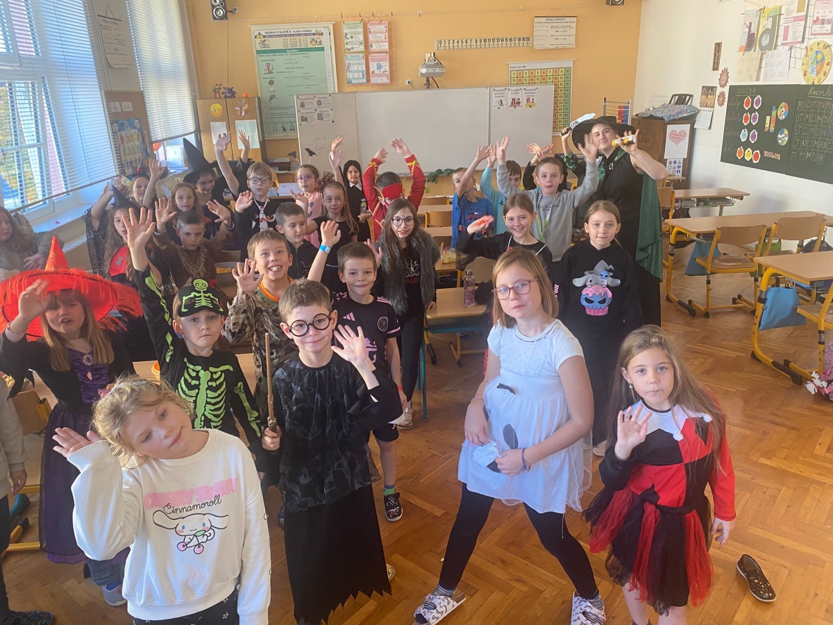 Dnešní školní družina se proměnila v kouzelný halloweenský svět plný úkolů, smíchu a malých strašidýlek. Na děti čekalo mnoho strašidelných i legračních disciplín- slalom na koštěti, vození dýně v kolečku, házení kroužku nebo nošení dračího oka na lžíci. Nechyběly ani úkoly pro odvážné: děti musely najít cestu z pavučiny ven a ve strašidelném domku sáhnout do čarodějné bedny, kde na ně čekala odměna. Poté si každý mohl ozdobit vlastní halloweenský perníček a pochlubit se svým výtvorem. Na vedlejší budově děti také plnily tematické aktivity- foukaly brčkem malé pavoučky po lavici, zkoušely trefit halloweenský klobouk obručí, chytaly ,,rybičky" a nakonec se pomocí papírových ,,kroků" dostávaly až k podzimním listům, kde na ně čekala odměna. Následovala halloweenská párty, při které se všichni pořádně vyřádili.