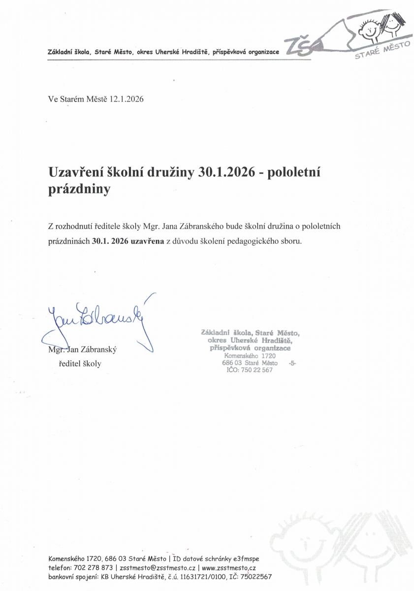 Uzavření školní družiny na pololetní prázdniny dne 30.1.2026